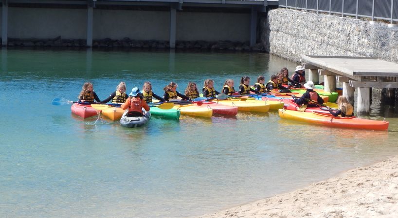 • A group of students participating in an aquatics lesson in perfect conditions.